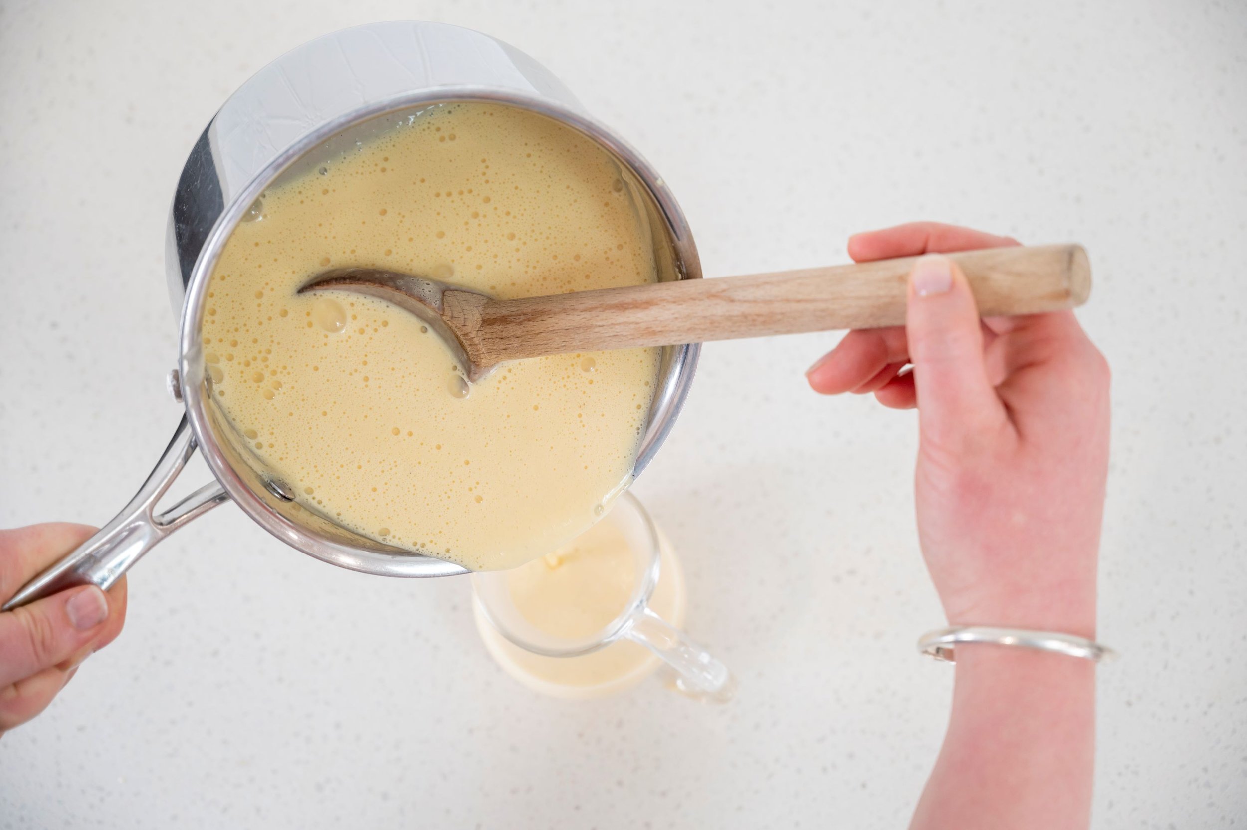 3. Whisk the milk into the egg and sugar then return to the saucepan and back on the heat.